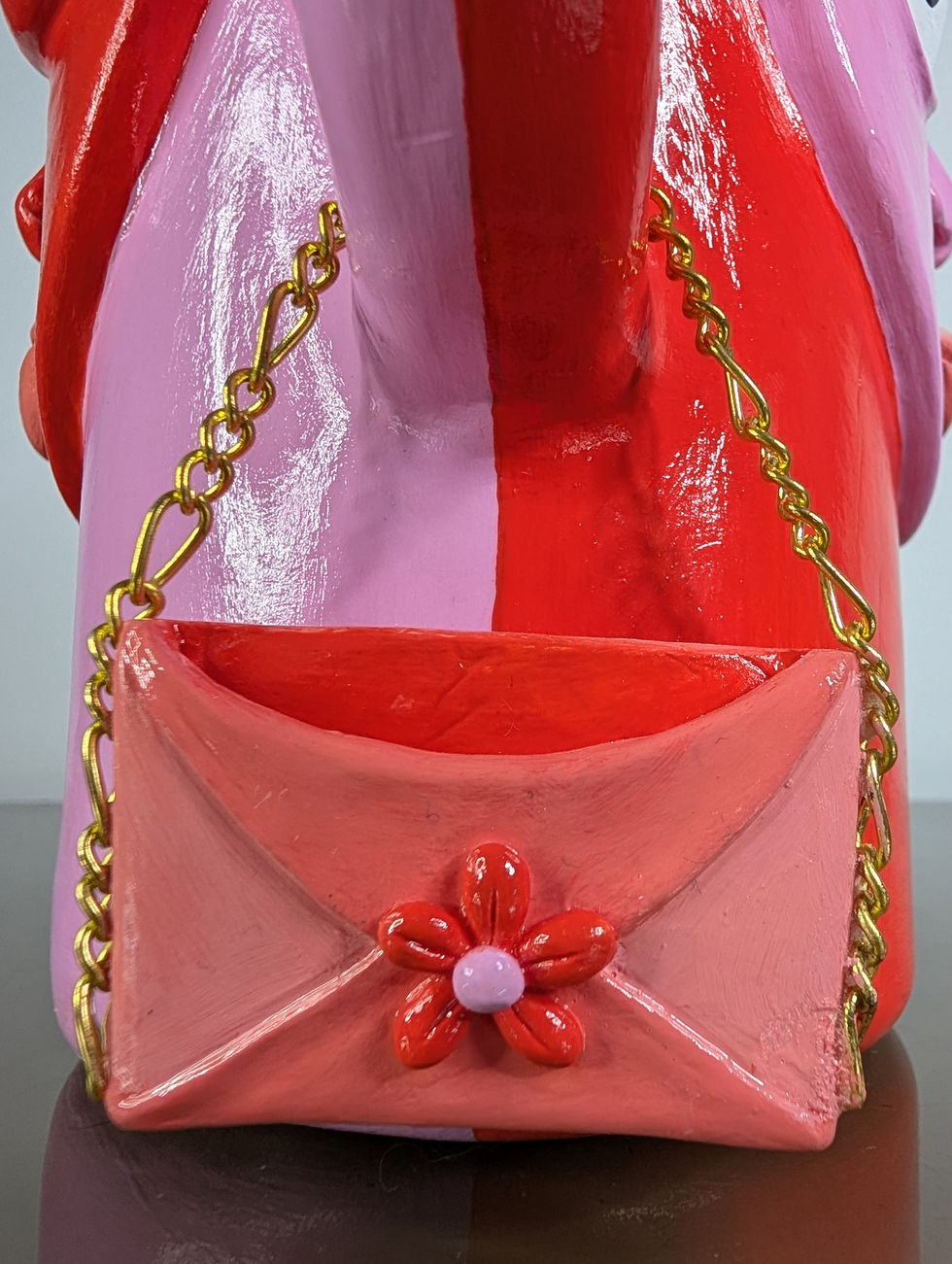 Le vase se décline dans des teintes douces de rose clair et d’orange. Sur l’une des anses, un petit détail en forme de sac à main permet d’y glisser un petit mot ou un élément décoratif, ajoutant une touche personnelle et poétique.