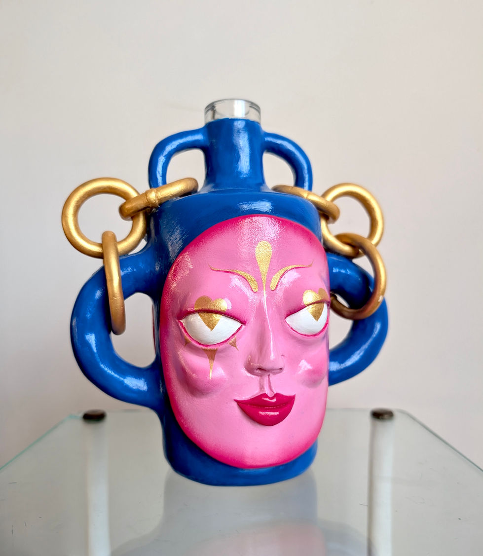 Les visages, ronds et expressifs, se parent d’un dégradé de rose magenta et rose pâle, contrastant avec l’intensité du bleu profond du vase. Sa forme de jarre, proche de celle d’une dame-jeanne, permet d’accueillir quelques fleurs seulement, invitant à une composition minimaliste et sculpturale.